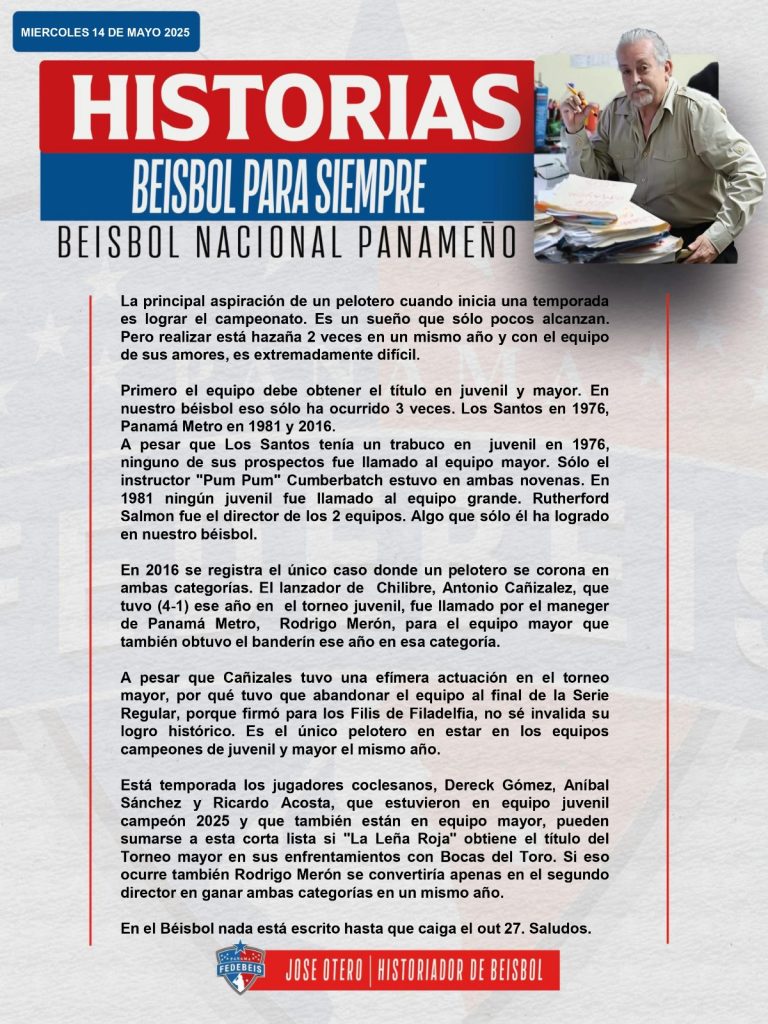 Está temporada los jugadores coclesanos, Dereck Gómez, Aníbal Sánchez y Ricardo Acosta, que estuvieron en equipo juvenil campeón 2025 y que también están en equipo mayor, pueden sumarse a esta corta lista si «La Leña Roja» obtiene el título del Torneo mayor en sus enfrentamientos con Bocas del Toro. Si eso ocurre también Rodrigo Merón se convertiría apenas en el segundo director en ganar ambas categorías en un mismo año.