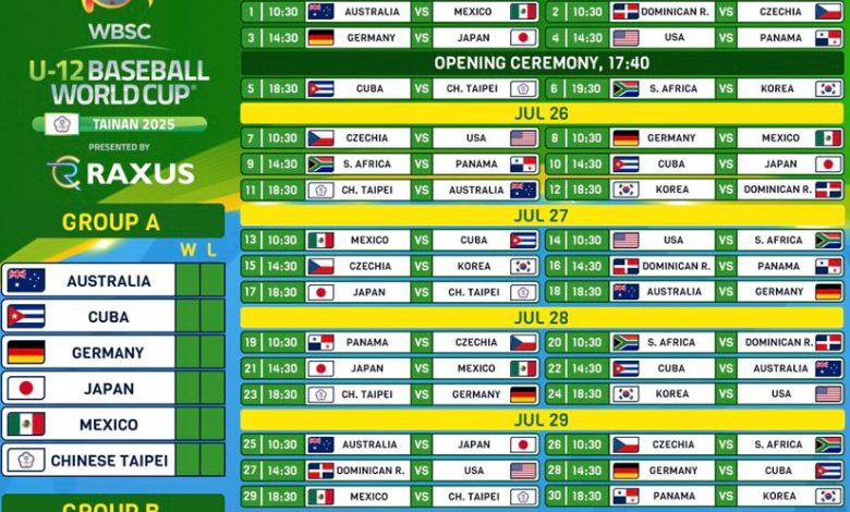 Prensa. Fedebeis. Panamá abre su participación en el Campeonato Mundial U12 ante Estados Unidos el próximo 25 de julio, teniendo como escenario el estadio Asia Pacific Field II, a eso de las 2:30 p.m. horario local en Tainán, Taiwán, sede del evento, y 1:30 a.m. hora local en territorio panameño.