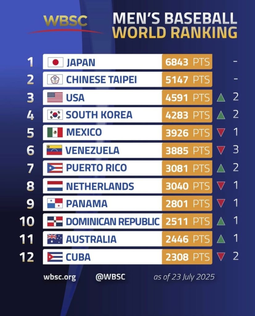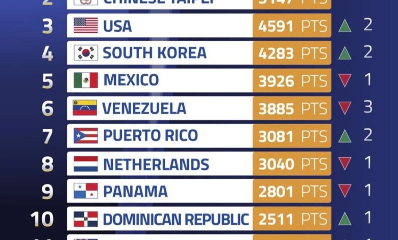 El ranking, liderado nuevamente por Japón (6843 pts.), posiciona a China Taipéi y Estados Unidos en el segundo y tercer lugar, respectivamente. Equipos como Corea del Sur y Puerto Rico también escalaron posiciones gracias a sus recientes actuaciones internacionales.